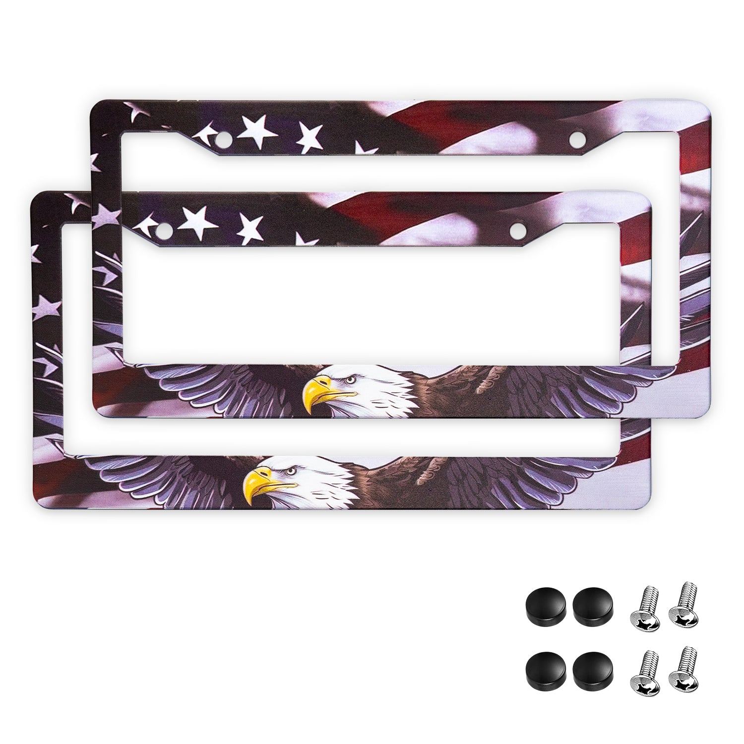 StandardAutoPart American Flag License Plate Frames – Plastic USA Flag Car Tag Holder with Screws Caps and Patriotic Decals – Universal Fit