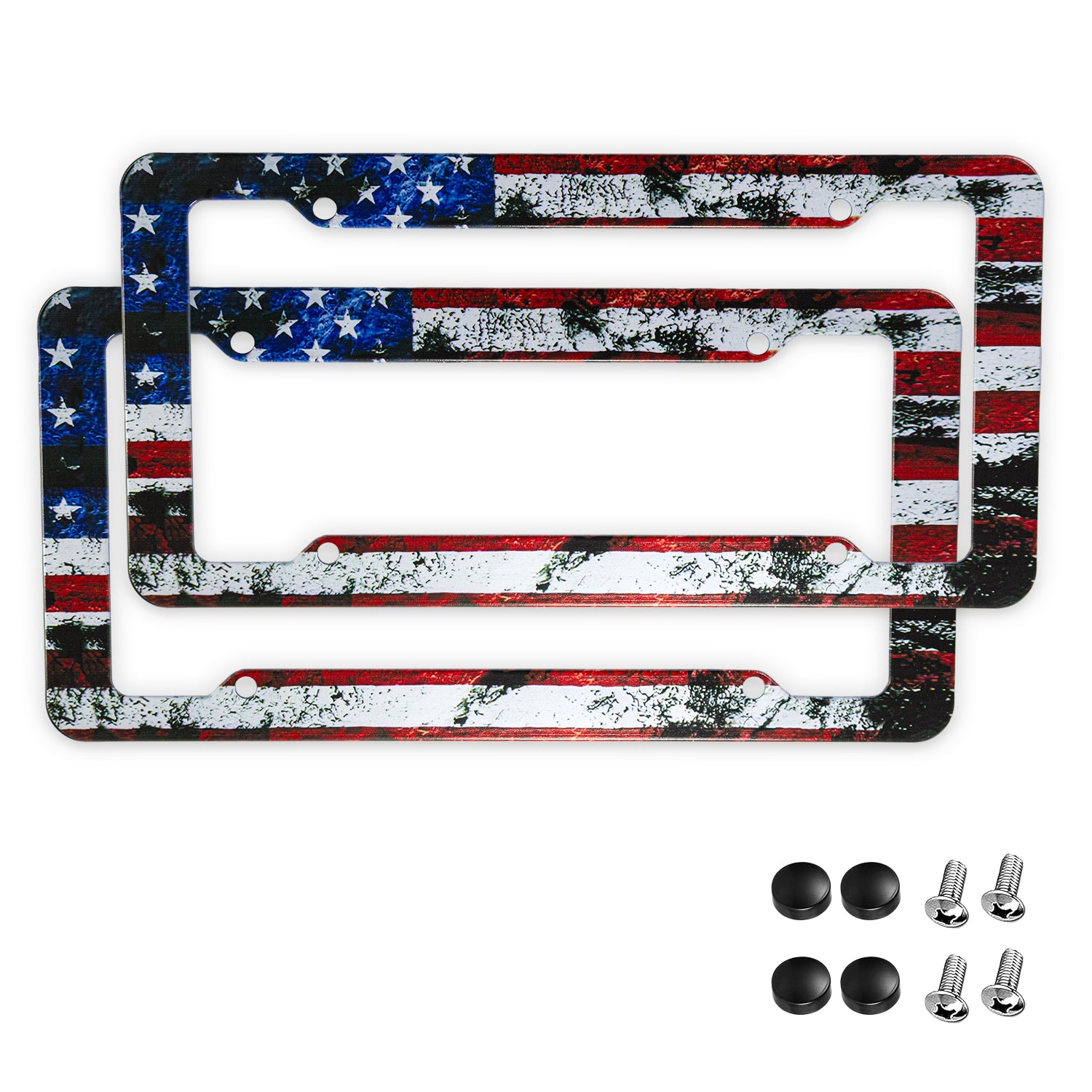 StandardAutoPart American Flag License Plate Frames – Plastic USA Flag Car Tag Holder with Screws Caps and Patriotic Decals – Universal Fit