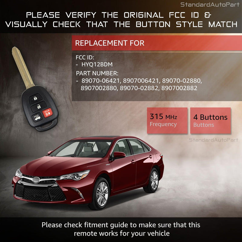 Remote Head Key Remote for Toyota Corolla Camry 2014 2015 2016 2017 HYQ12BDM H Chip