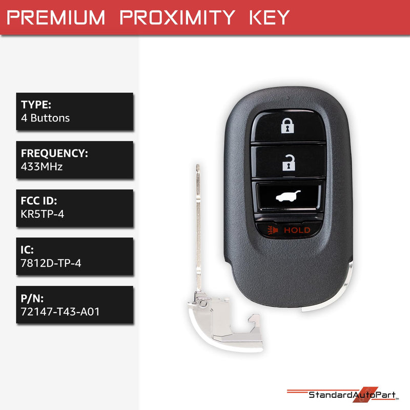StandardAutoPart Smart Proximity Key Fob Remote Compatible with Honda Civic CR-V HR-V Pilot Type R 2022 2023 2024 2025 KR5TP-4 72147-T43-A01 IC: 7812D-TP-4 (4 Button Hatch)